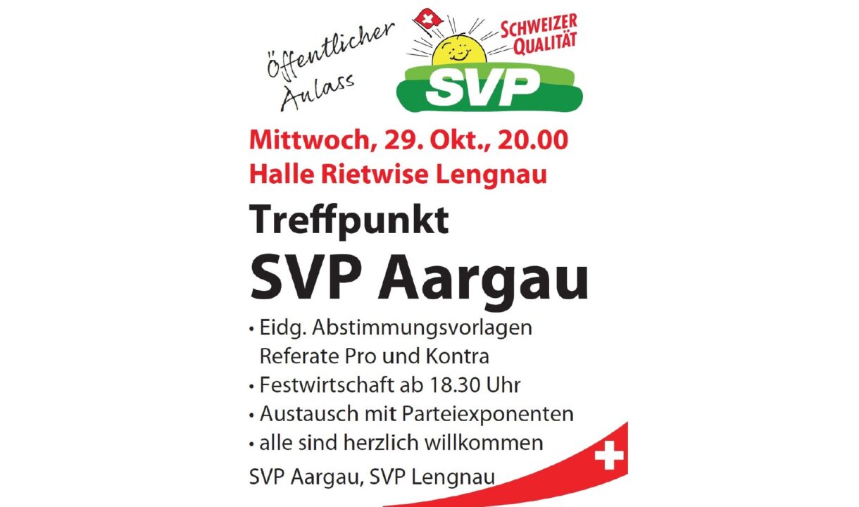 Die SVP Aargau und die SVP Lengnau laden zu einem öffentlichen Parteitag ein. Im Zentrum stehen die zwei nationalen Abstimmungsvorlagen, über die am 30. November 2025 abgestimmt wird. Nach der Begrüssung durch die Parteileitung folgt ein offener Austausch zu den bevorstehenden Abstimmungen.
